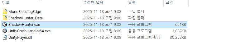 게임 파일 실행법: 압축 파일 해제 후 ShadowHunter.exe을 통해 게임을 실행 할 수 있습니다.