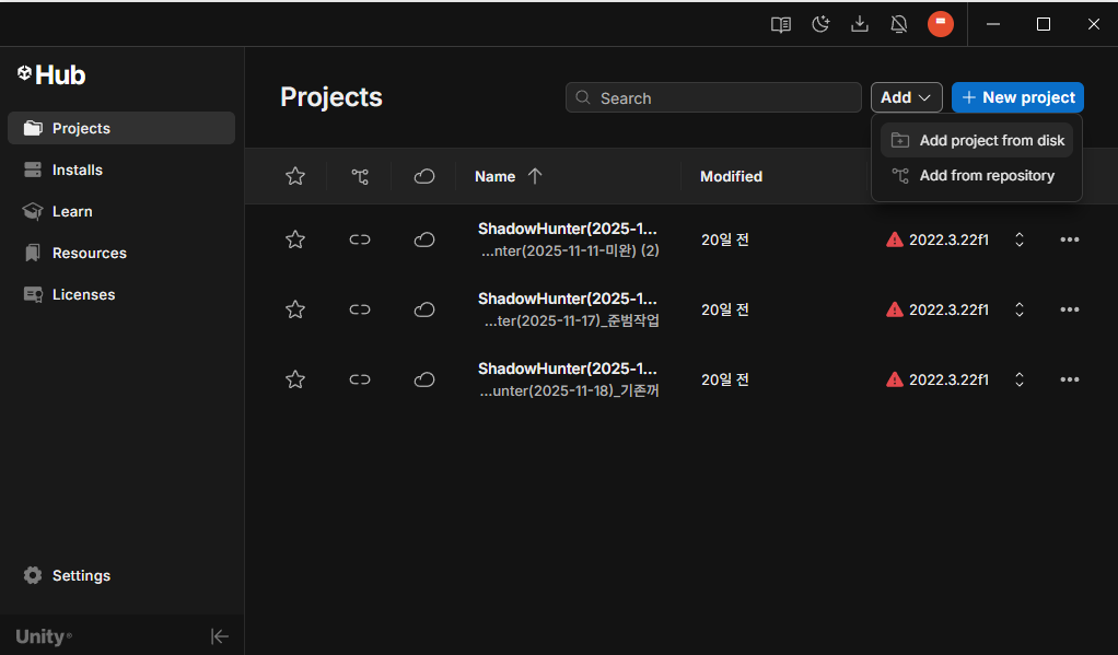 Add project from disk로 압축 해제한 소스 파일을 등록 후 Open